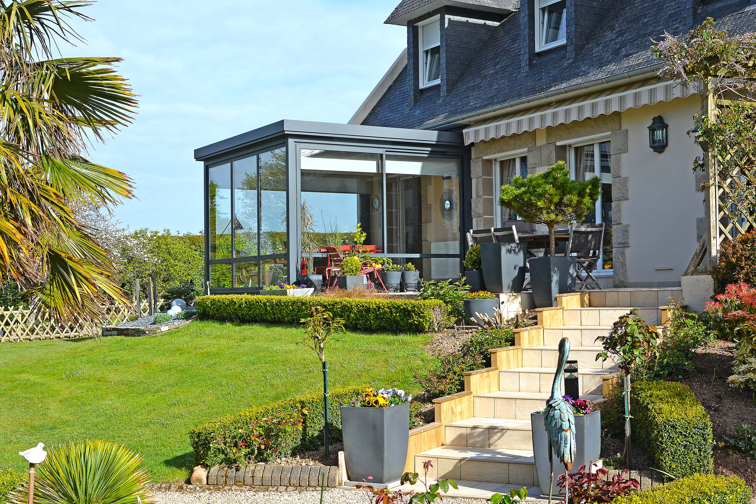 Très vitrée et lumineuse, la véranda vous offre un espace tourné vers le jardin dédié à la détente et aux loisirs. Idéale aux mi-saisons, ses larges baies vitrées et sa toiture légère laissent pénétrer un maximum de lumière et vous donnent la sensation d’une communion parfaite avec la nature en vous laissant profiter du soleil à l’abri des intempéries.